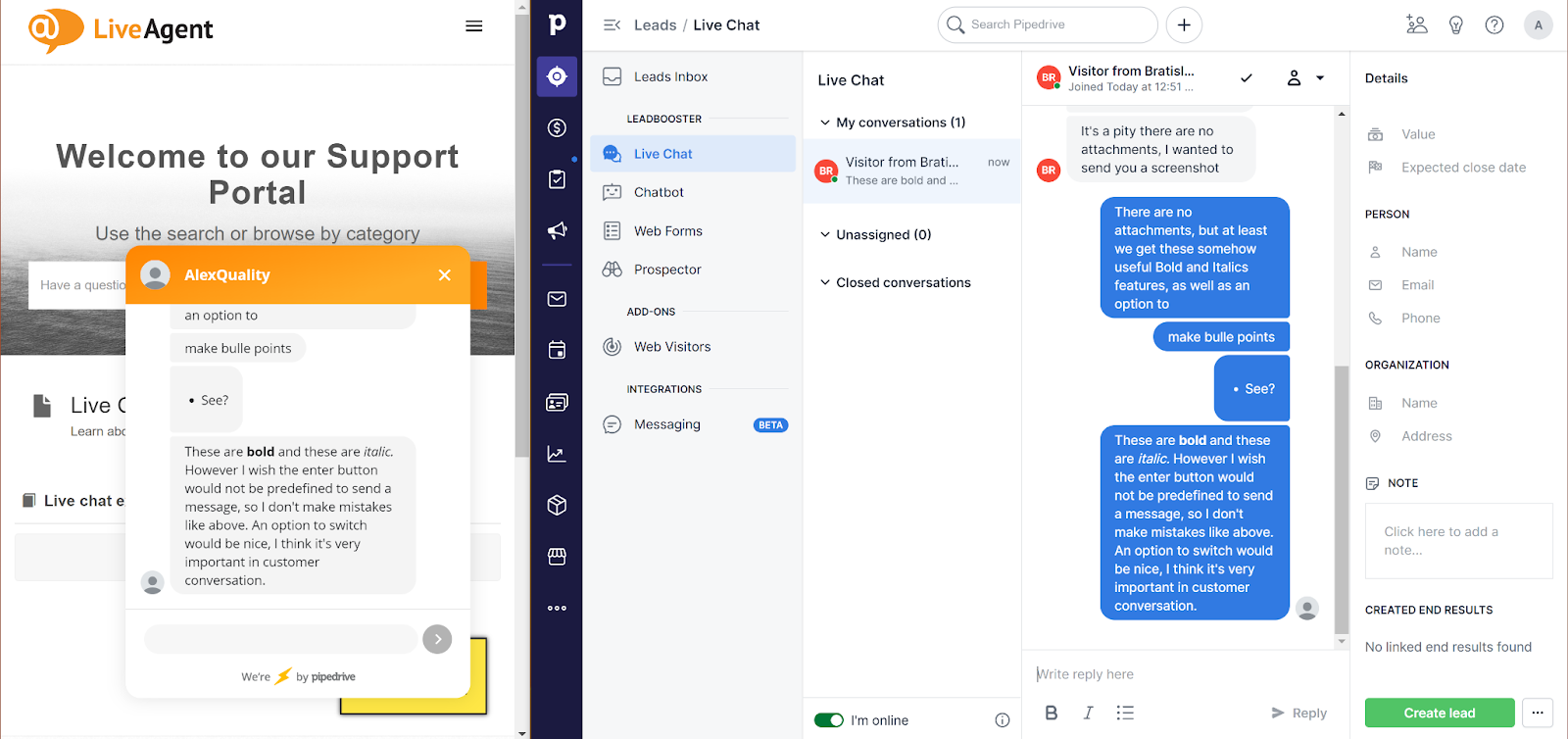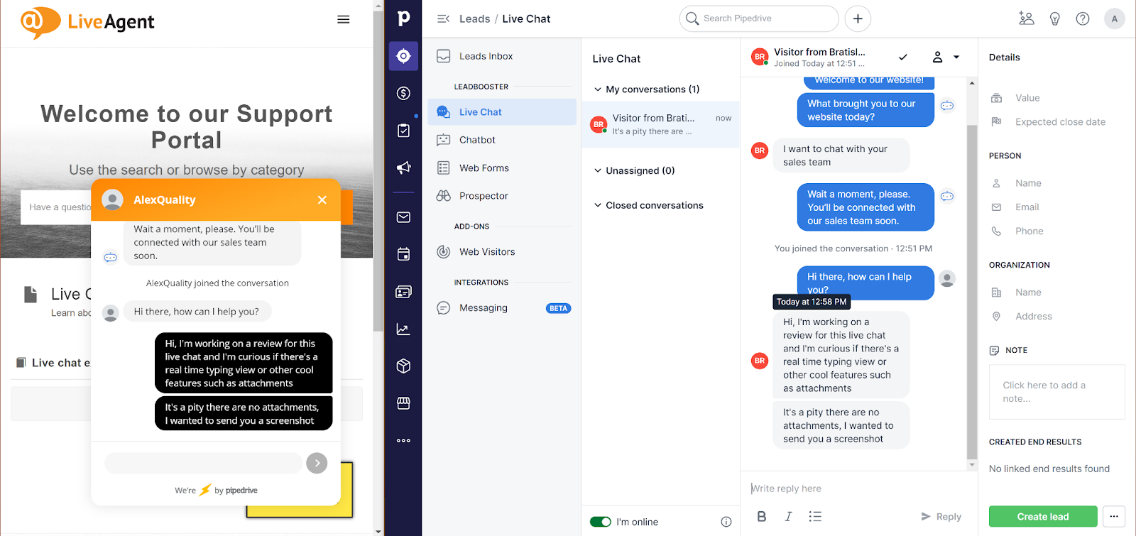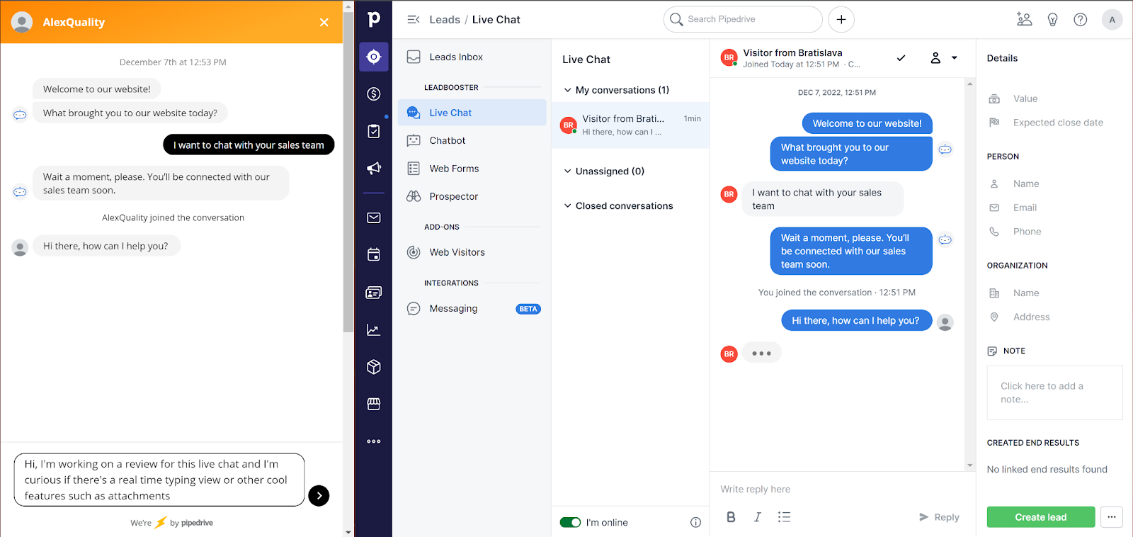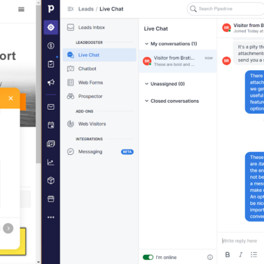 Il sito web di PipeDrive non riporta le esatte funzionalità di live chat disponibili, ad eccezione del chatbot e dell’integrazione con il resto degli strumenti del CRM per produrre più lead. La prossima sezione ti mostrerà l’esperienza di lavoro con la live chat di PipeDrive da entrambi i lati e ti illustrerà tutte le funzionalità disponibili.