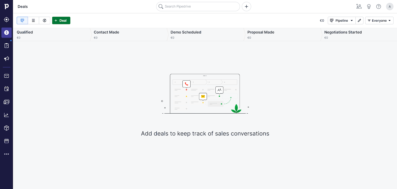 Iniziare a lavorare con PipeDrive è molto semplice, ti basterà fare una breve registrazione. Una volta terminata, potrai iniziare a dare un’occhiata al dashboard. PipeDrive non è una soluzione di live chat dedicata, quindi agli utenti viene presentata una grande quantità di opzioni e strumenti con cui cimentarsi. Tuttavia, l’interfaccia è piuttosto ordinata. È molto ben rifinita, per nulla disordinata e ha un aspetto mirato, quindi non dovresti avere problemi ad accedere a qualsiasi funzionalità tu stia cercando.