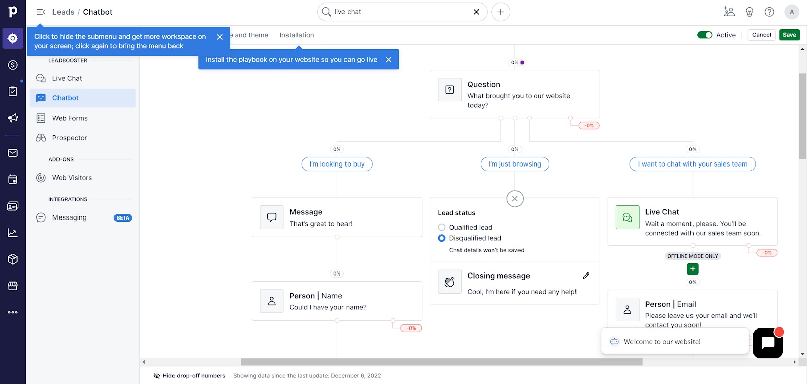 Il passo successivo è la configurazione del flusso. Poiché questa è la specialità di PipeDrive, non è possibile saltare questo processo; è necessario configurare il flusso iniziale attraverso un sistema simile al routing IVR. Ti verrà presentata una rappresentazione visiva delle possibilità e delle azioni che puoi automatizzare con la tua live chat. Fortunatamente, se decidi di salvare le modifiche senza configurare nulla, non avrai problemi perché PipeDrive offre subito un flusso di chat predefinito. Tuttavia, l’automazione è ancora presente e non può essere disattivata. A proposito, questo riguarda solo gli elementi essenziali della conversazione.