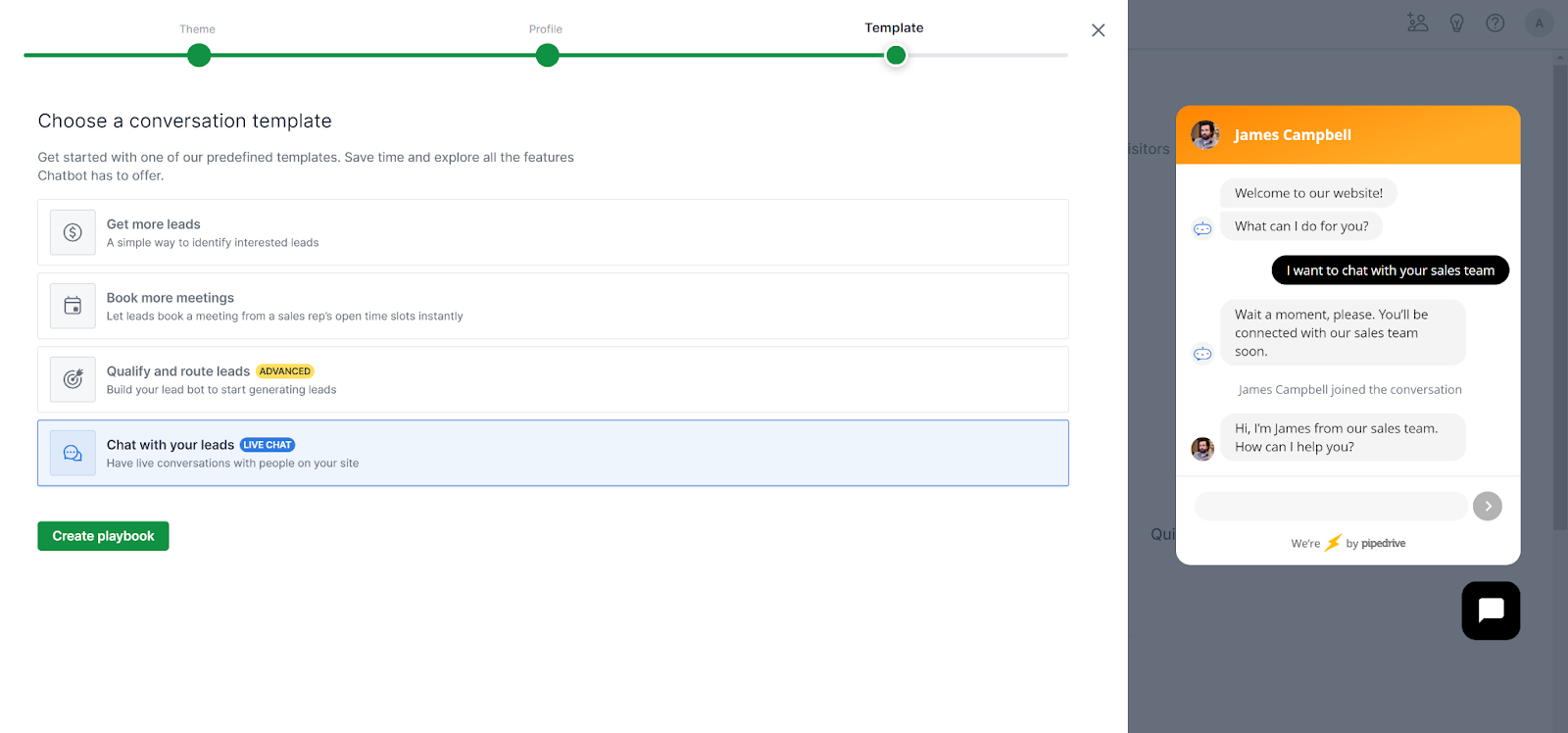 Nella sezione successiva, PipeDrive ti chiederà obbligatoriamente di definire il tuo chatbot (anche se non lo vuoi). La sezione successiva ti chiede lo scopo della tua live chat e puoi selezionare se vuoi generare più contatti, prenotare più incontri o qualificare e indirizzare i contatti. Infine, c’è un’opzione per avere conversazioni dal vivo con i clienti, quindi assicurati di scegliere questa opzione se non sei interessato a un chatbot.
