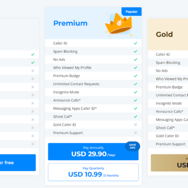 Truecaller offre tre diverse opzioni di prezzo. Ognuna di esse include diverse funzionalità avanzate per migliorare l’esperienza dell’utente. Sfortunatamente, non è disponibile una prova gratuita per le versioni a pagamento e non verrai rimborsato se termini l’abbonamento.
