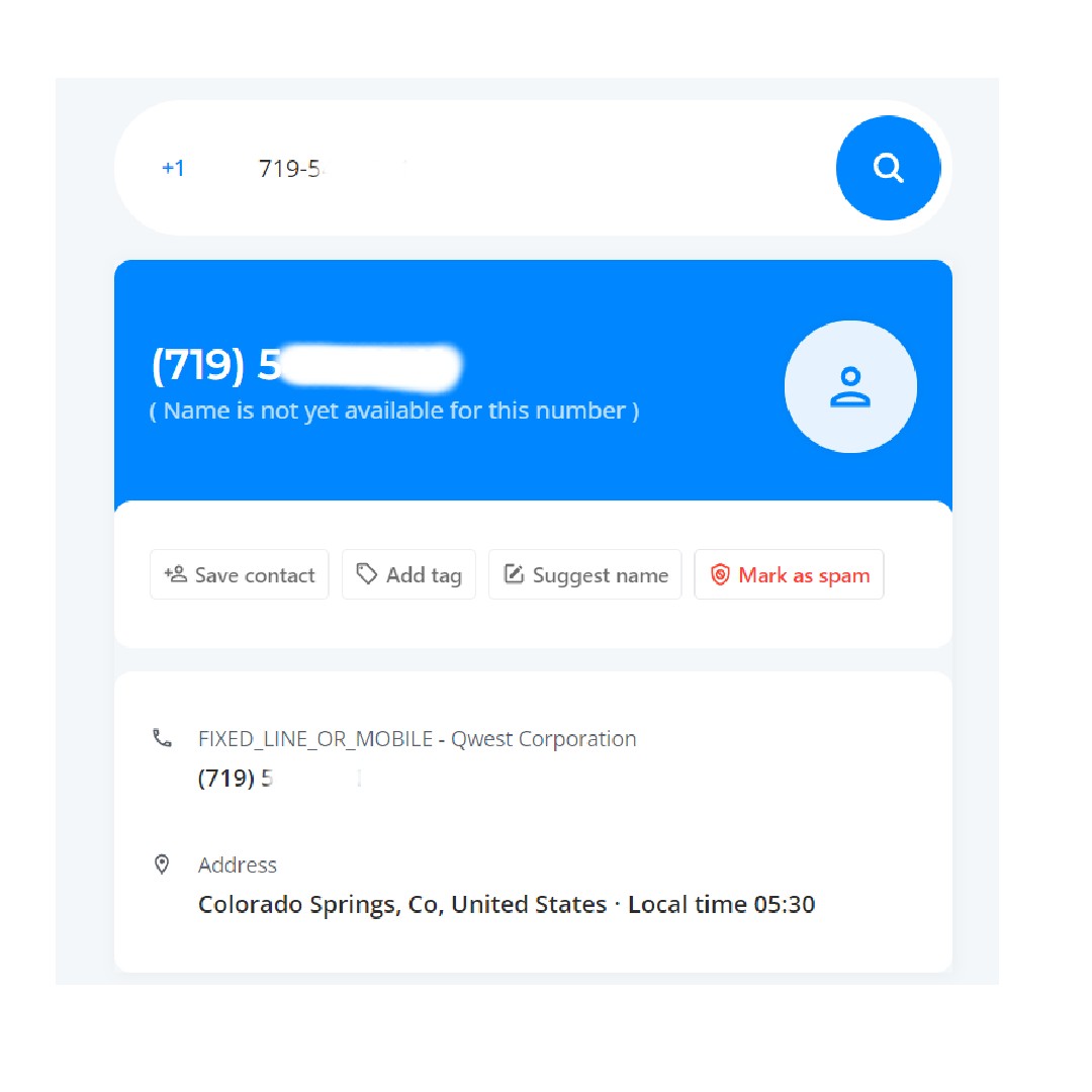 Dopo ogni ricerca, puoi scegliere cosa fare di queste informazioni di contatto. Puoi “Salvare il contatto” per il futuro, puoi “Aggiungere un tag“, “Suggerire un nome” se non c’è un nome associato o puoi fare clic su “Segna come spam” se ritieni che il chiamante non sia affidabile.