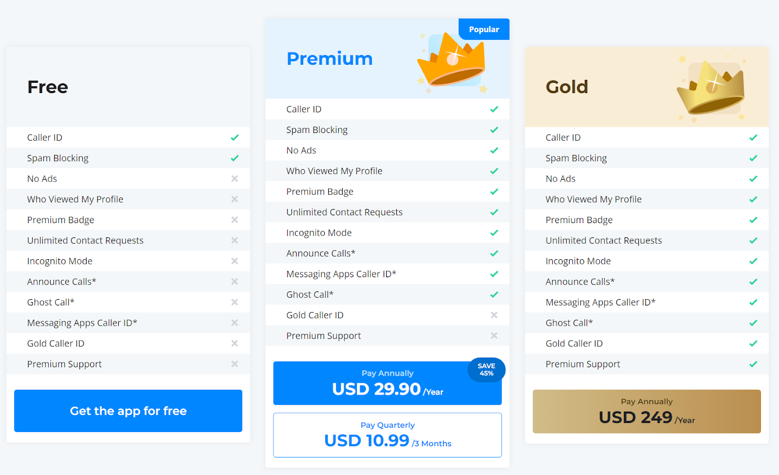 Questa versione può essere pagata solo annualmente, al costo di $249. Include tutte le funzionalità della versione gratuita e di quella premium, oltre a funzionalità aggiuntive come l’ID Caller Gold e il supporto Premium. Il supporto Premium fornisce una risposta più rapida a qualsiasi domanda.