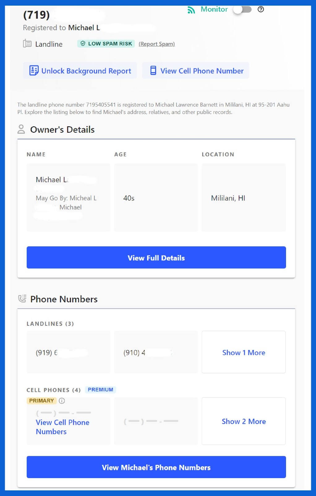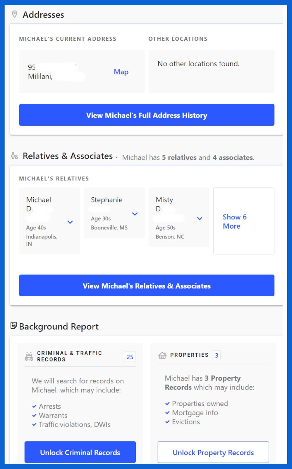 In alcuni casi, il sito web/app può generare risultati più dettagliati. In questo caso, puoi visualizzare il nome associato al numero e dettagli quali l’indirizzo, l’età della persona, altri numeri di telefono che potrebbero essere collegati alla stessa persona, parenti e molto altro ancora. Tuttavia, se hai bisogno di ulteriori informazioni sui precedenti penali e sui rapporti di servizio, queste sono disponibili dopo aver pagato un costo aggiuntivo.