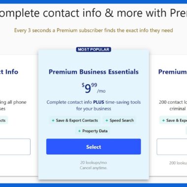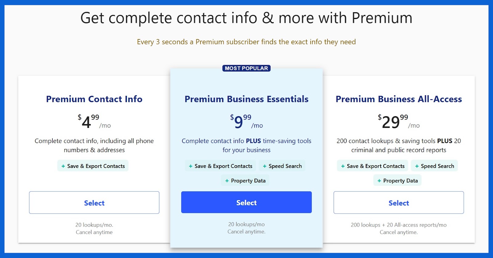Il terzo piano di abbonamento costa $29,99/mese e include fino a 200 ricerche al mese, 20 segnalazioni penali e pubbliche e tutte le altre funzionalità incluse nel Premium Business Essentials. Come con gli altri, potrai pagare mensilmente o annualmente, per un totale di $179,88, pari a $14,99/mese.