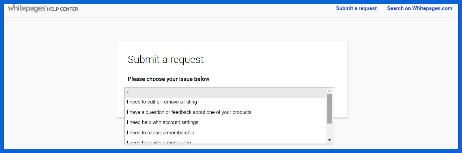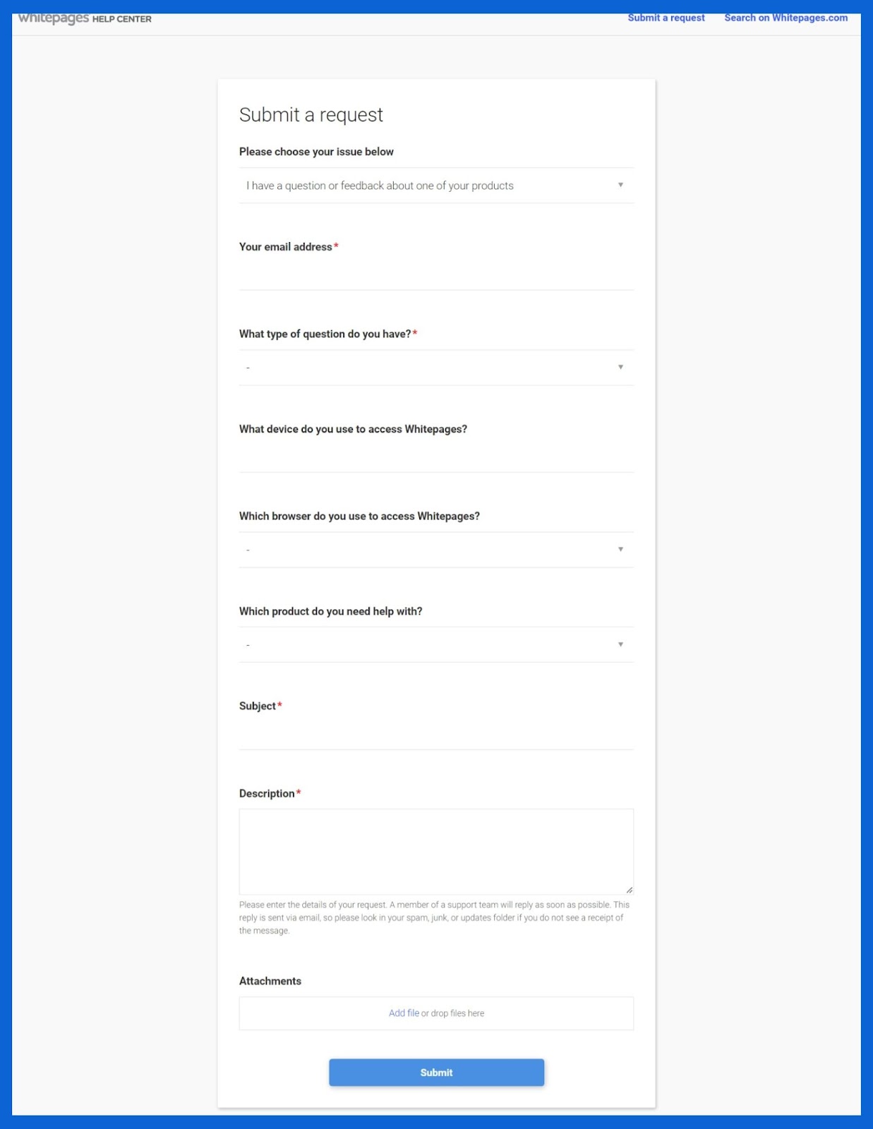 Puoi metterti in contatto con l’assistenza clienti di Whitepages compilando un modulo di richiesta sul loro sito web. Non offrono live chat o assistenza clienti istantanea.