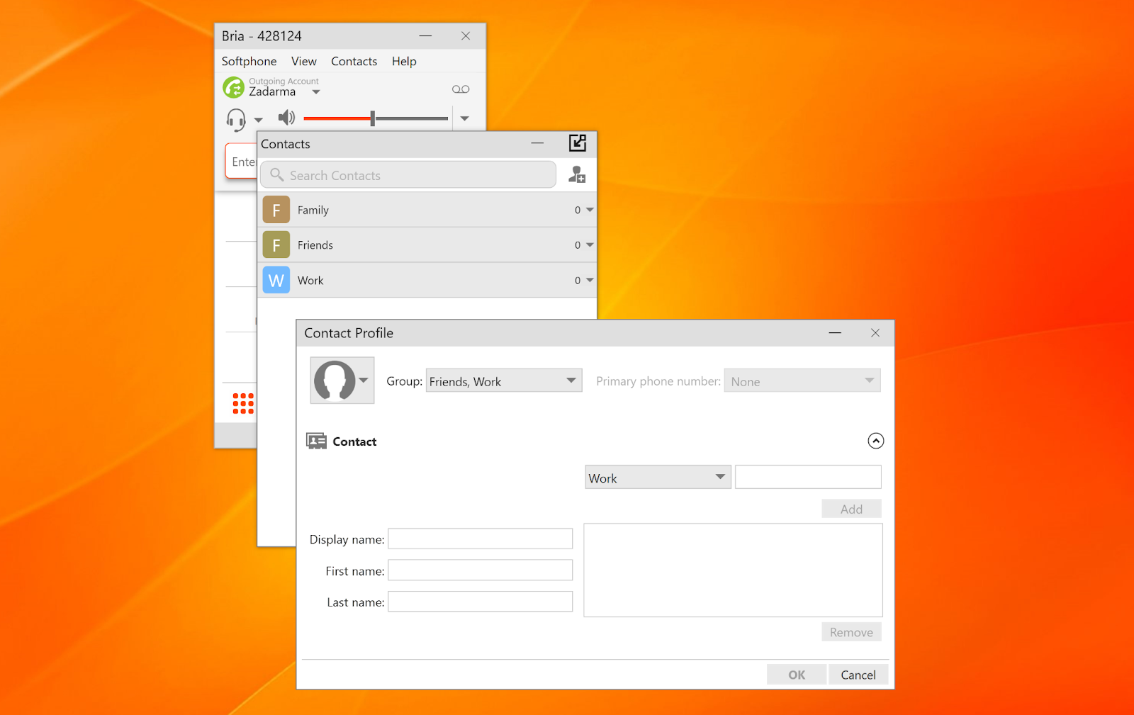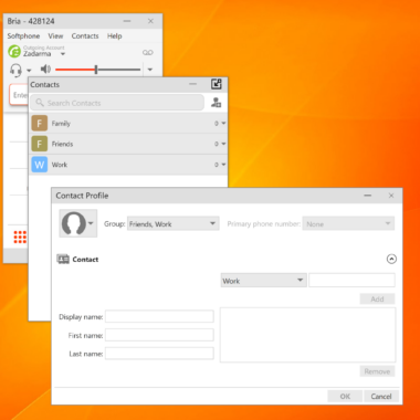 La creazione di un nuovo contatto offre alcune opzioni: nome visualizzato, nome, cognome e un campo per salvare numeri e indirizzi: numero di softphone, numero di lavoro, numero di casa, indirizzo e-mail, sito web e l’opzione “Altro” in cui gli utenti possono inserire dati personalizzati. Non esiste un’opzione che permetta agli utenti di scrivere un commento o una semplice nota nei dettagli del contatto, il che rappresenta un altro svantaggio dell’elenco dei contatti di Bria.