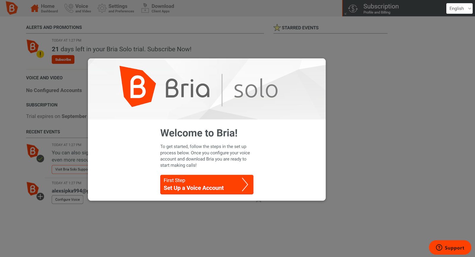 Il processo inizia con la creazione di un nuovo account sul sito web di Bria. Ho iniziato creando una versione di prova. Ho scelto la versione di prova di Bria Solo ai fini di questa recensione. Ci vogliono solo un paio di minuti per completare l’operazione e il sito non mi ha obbligato a selezionare alcun metodo di pagamento o ad aggiungere informazioni sulla carta di credito. Una volta forniti i miei dati, sono stato accolto nel mio account con un semplice messaggio che mi diceva cosa fare dopo.